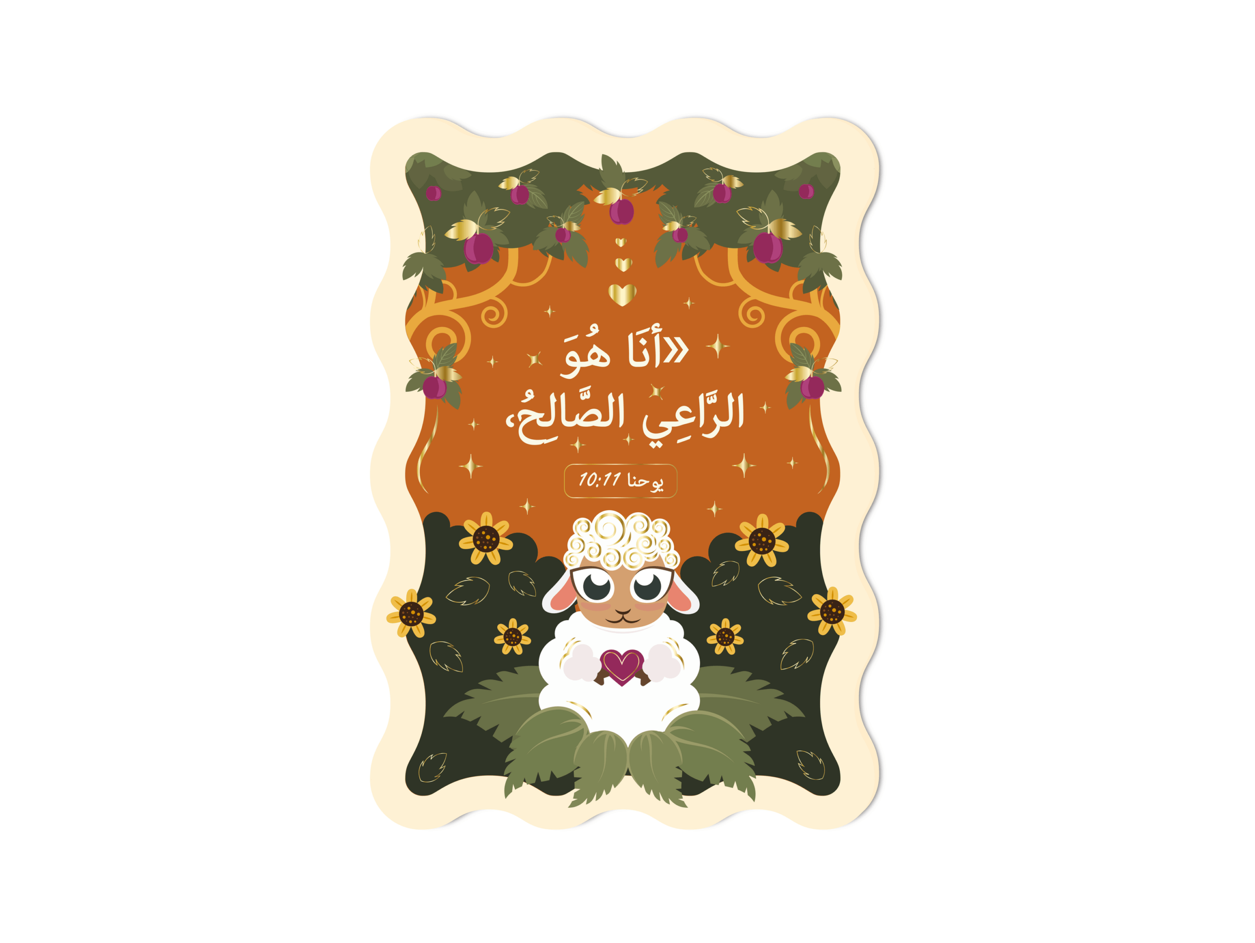 De kaart heeft een unieke vorm en een vrolijk motief van een lammetje. Eronder staat de tekst uit Johannes 10:11, Jezus is de goede Herder
