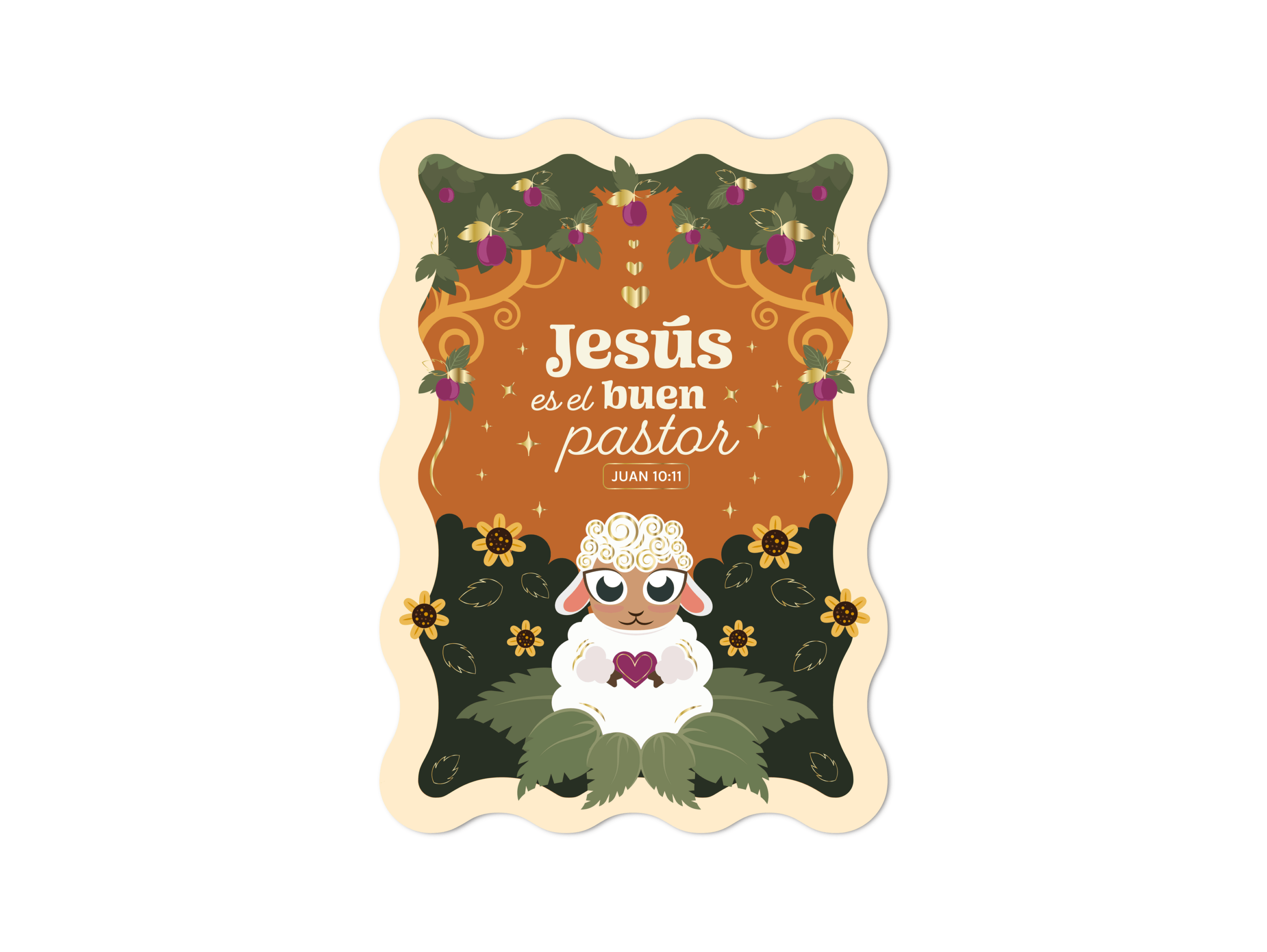 De kaart heeft een unieke vorm en een vrolijk motief van een lammetje. Eronder staat de tekst uit Johannes 10:11, Jezus is de goede Herder