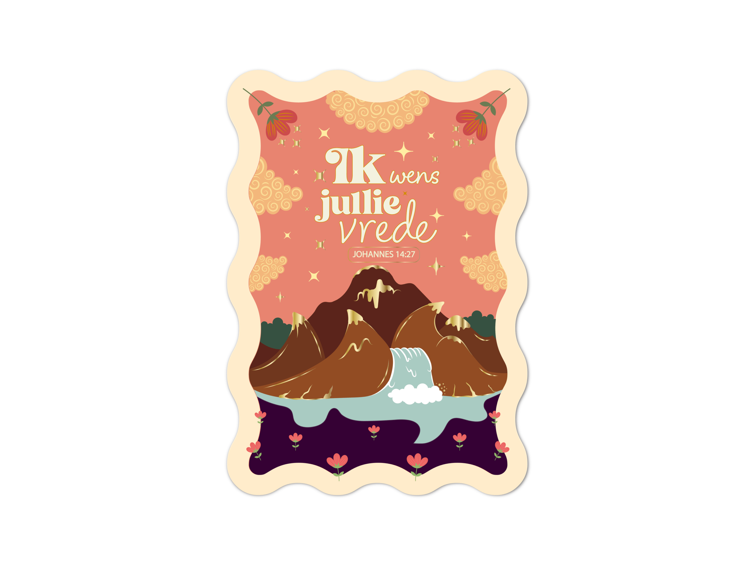 De kaart heeft een unieke vorm en een mooie illustratie van een berglandschap. Op de kaart staat de tekst uit Johannes 20:19, Ik wens julie vrede.