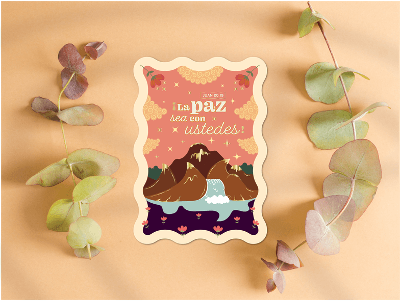 De kaart heeft een unieke vorm en een mooie illustratie van een berglandschap. Op de kaart staat de tekst uit Johannes 20:19, Ik wens julie vrede.